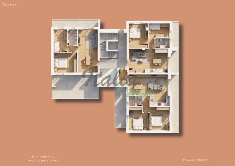L’appartamento che andiamo a descrivere si trova al primo piano del palazzo ed è dotato di due terrazze (per un totale di 43 mq) sui due lati dell’abitazione.