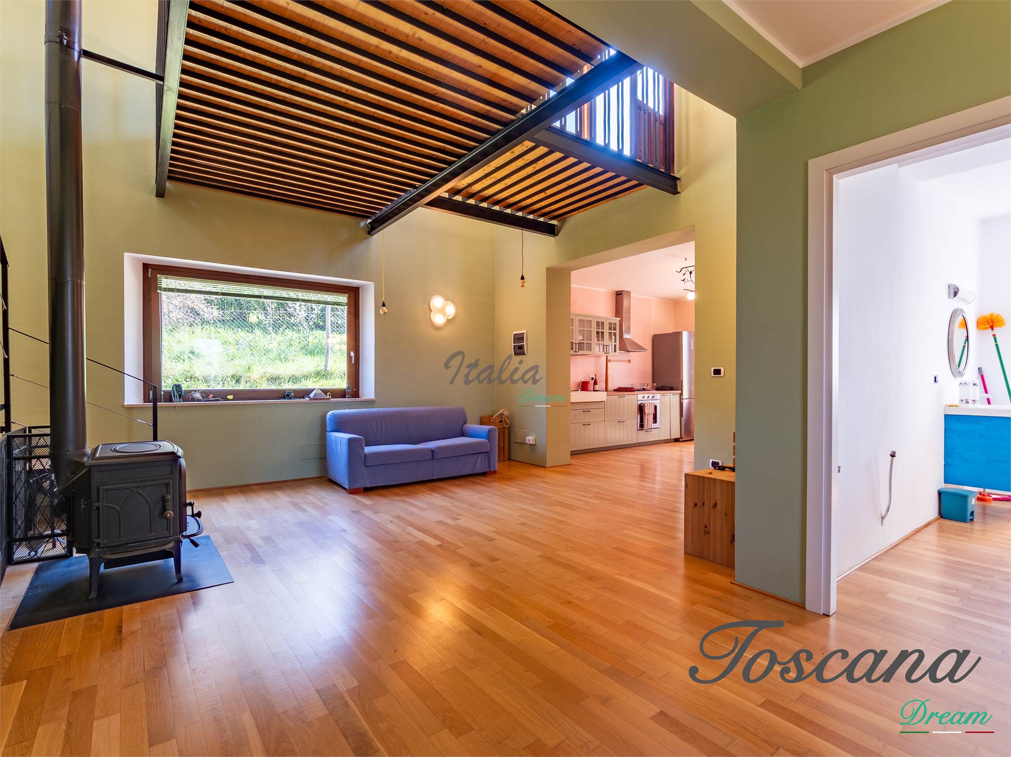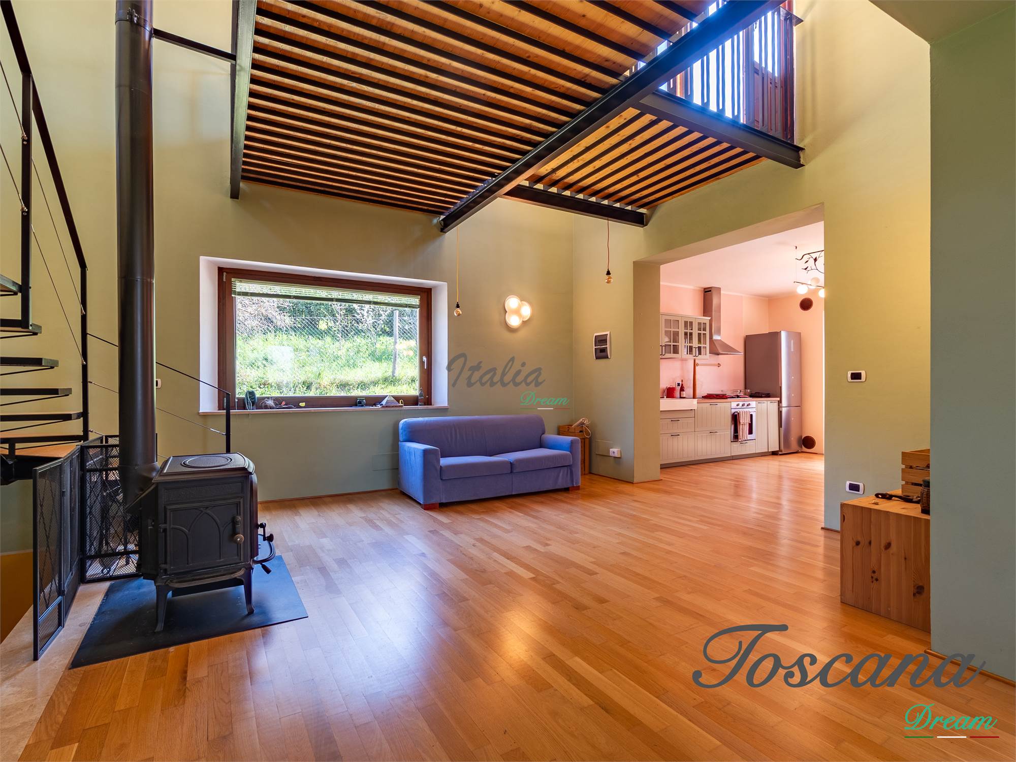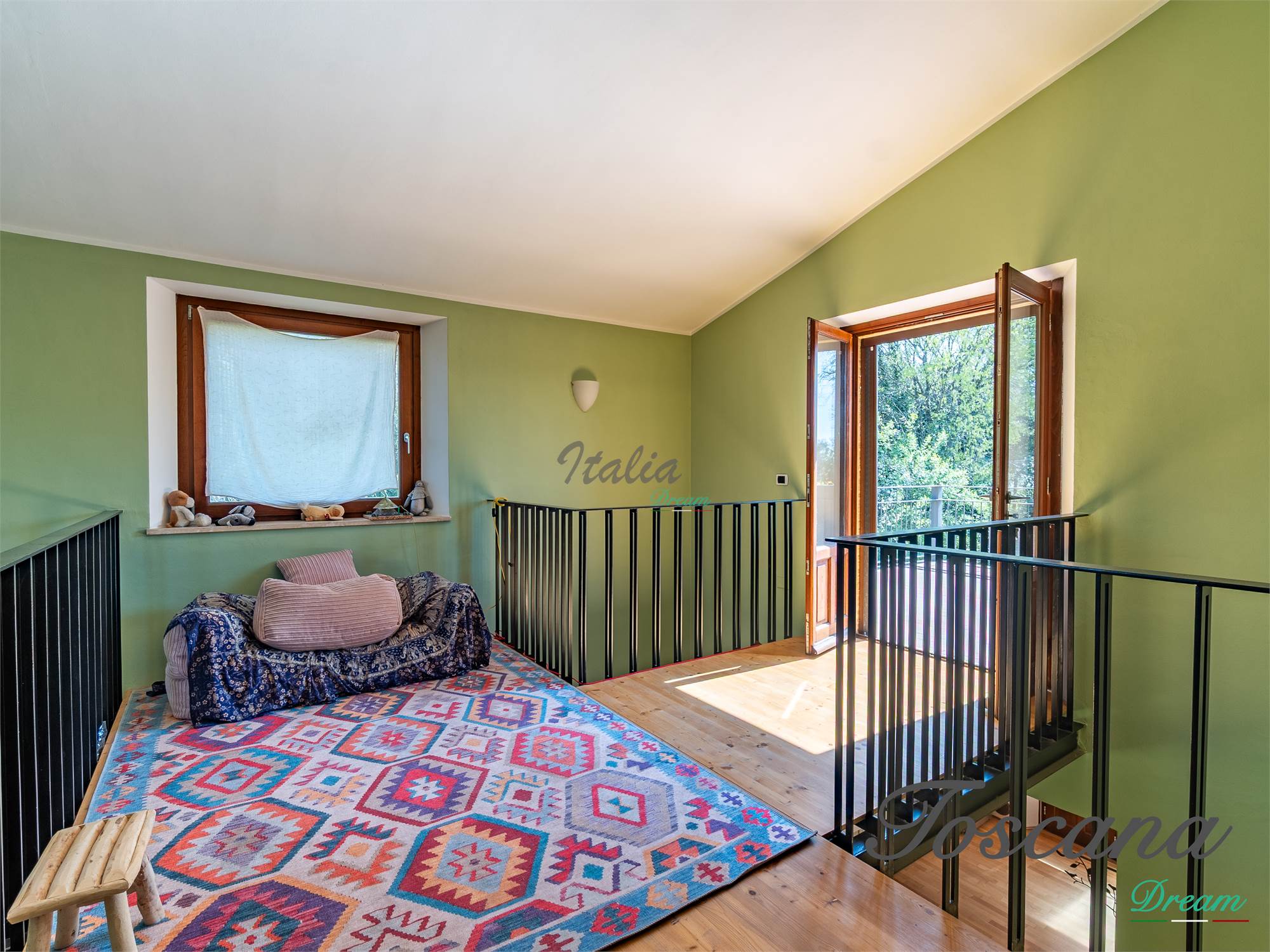 Piano Primo (Area Living): L’ingresso avviene tramite un accogliente portico veranda che conduce a un soggiorno a doppia altezza di grande impatto scenografico. Da qui si accede alla cucina abitabile, collegata a una veranda panoramica vetrata, concepita come un quadro naturale sul giardino e sulla valle. Completa il piano un bagno di servizio.