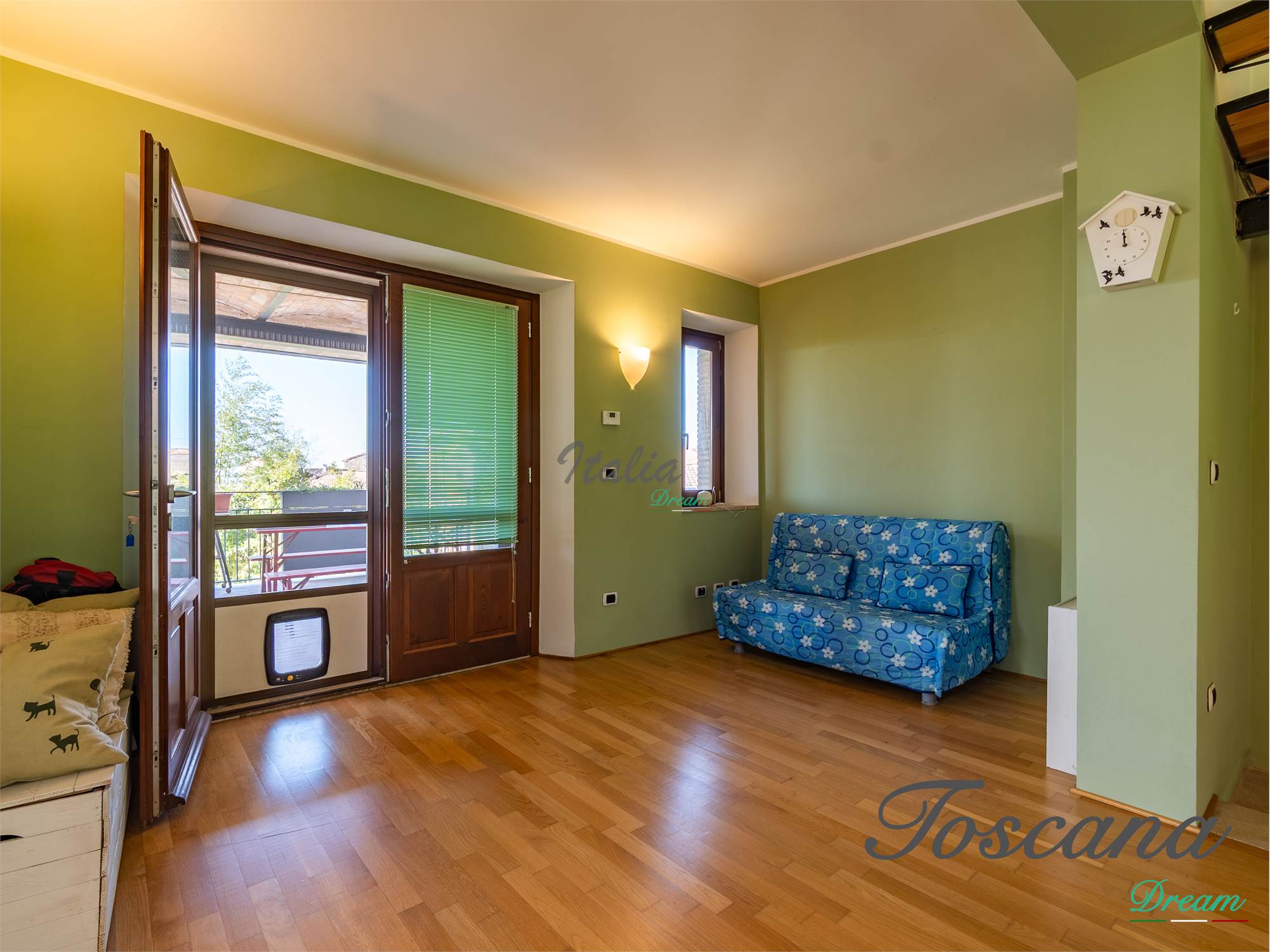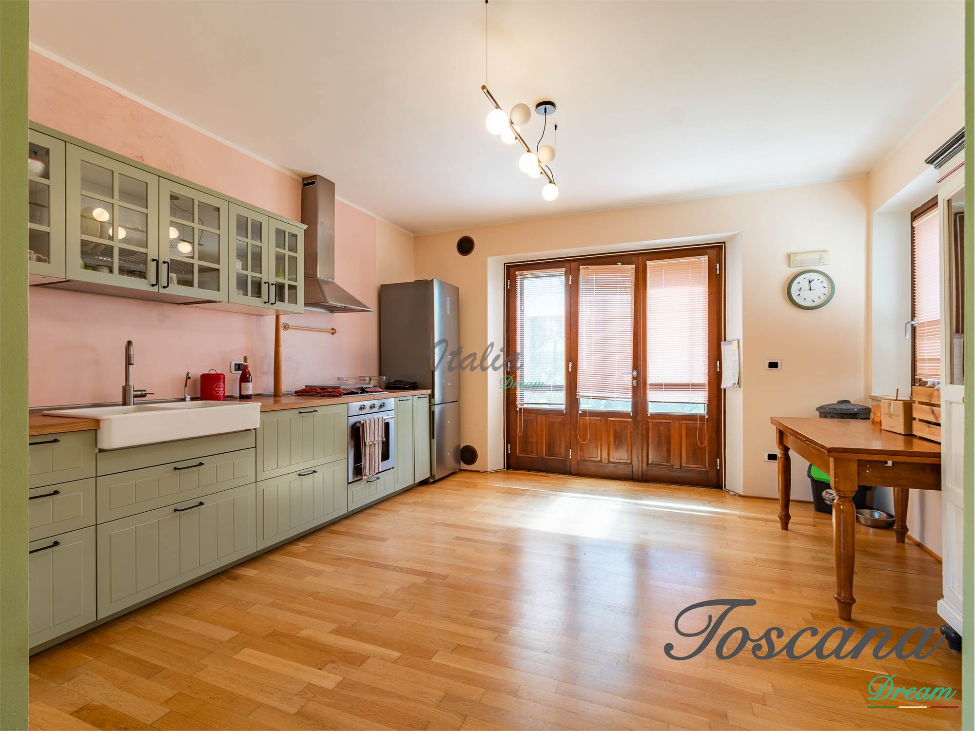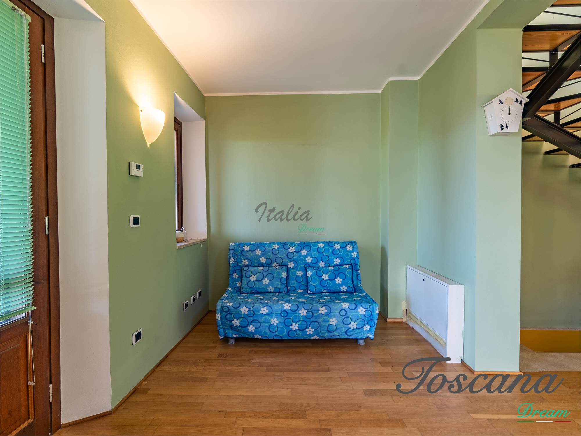 Piano Primo (Area Living): L’ingresso avviene tramite un accogliente portico veranda che conduce a un soggiorno a doppia altezza di grande impatto scenografico. Da qui si accede alla cucina abitabile, collegata a una veranda panoramica vetrata, concepita come un quadro naturale sul giardino e sulla valle. Completa il piano un bagno di servizio.